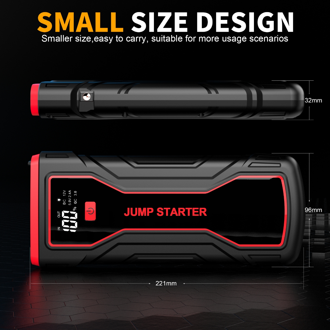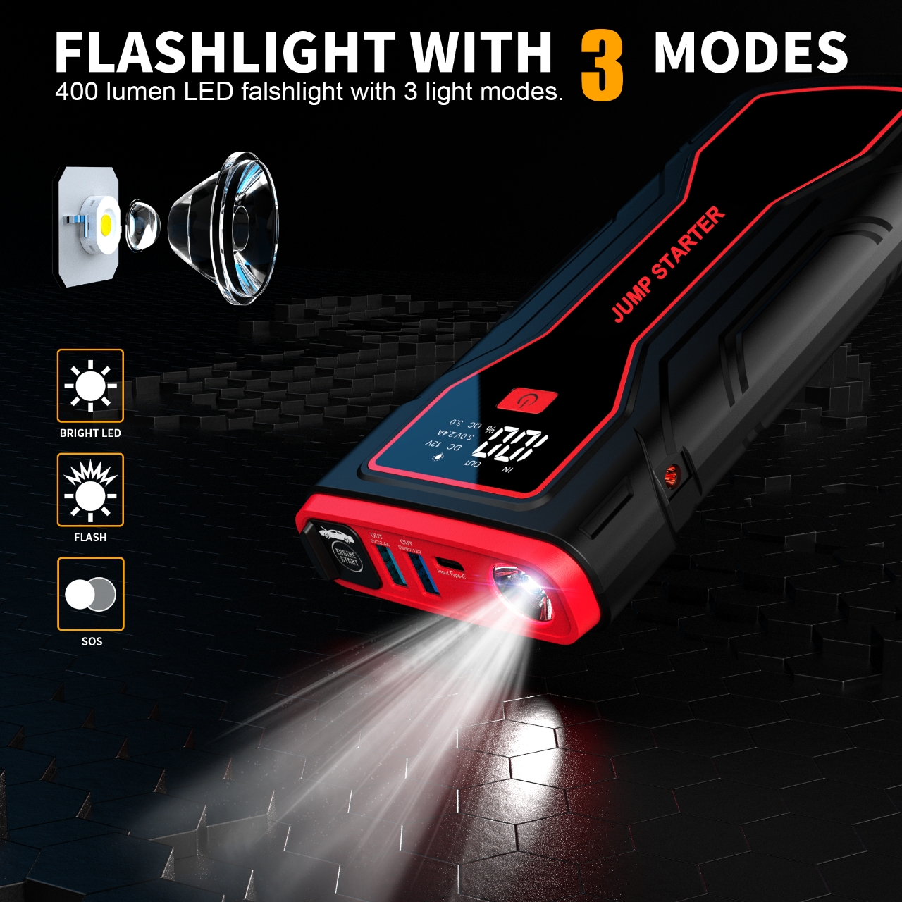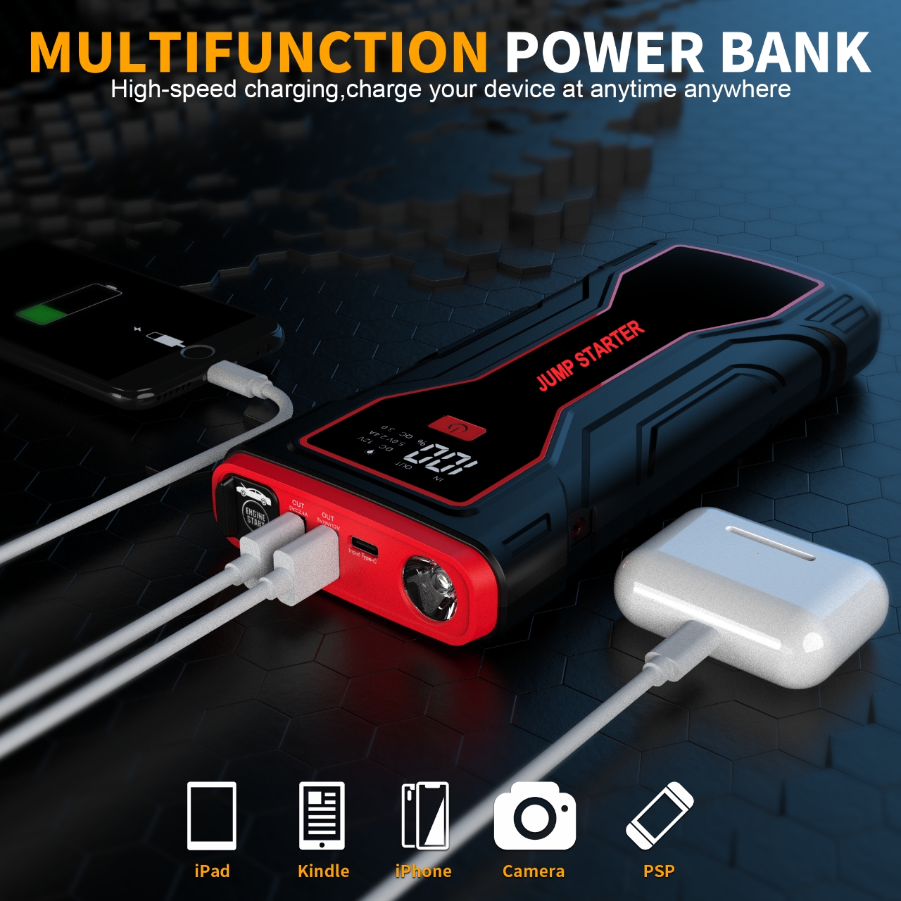 Be ready for anything with this all-in-one Jump Starter! Combining three essential tools into a compact device, it serves as your ultimate roadside companion. With the power to jump-start your vehicle in seconds, function as a multi-purpose power bank, and provide bright illumination as a flashlight, this versatile gadget keeps you moving without any interruptions.