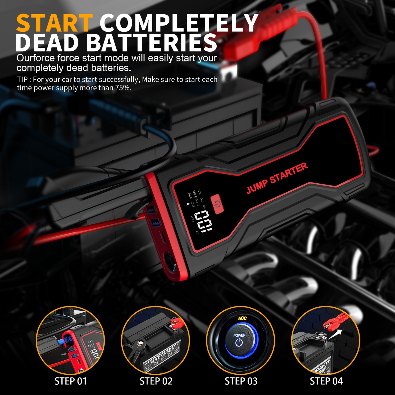 With a 3000A peak current portable jump starter is capable of jump-starting 8.5L gas and 6.0L diesel vehicles, from motorcycles, snowmobiles, cars, SUVs, trucks, lawn mowers, and boats.