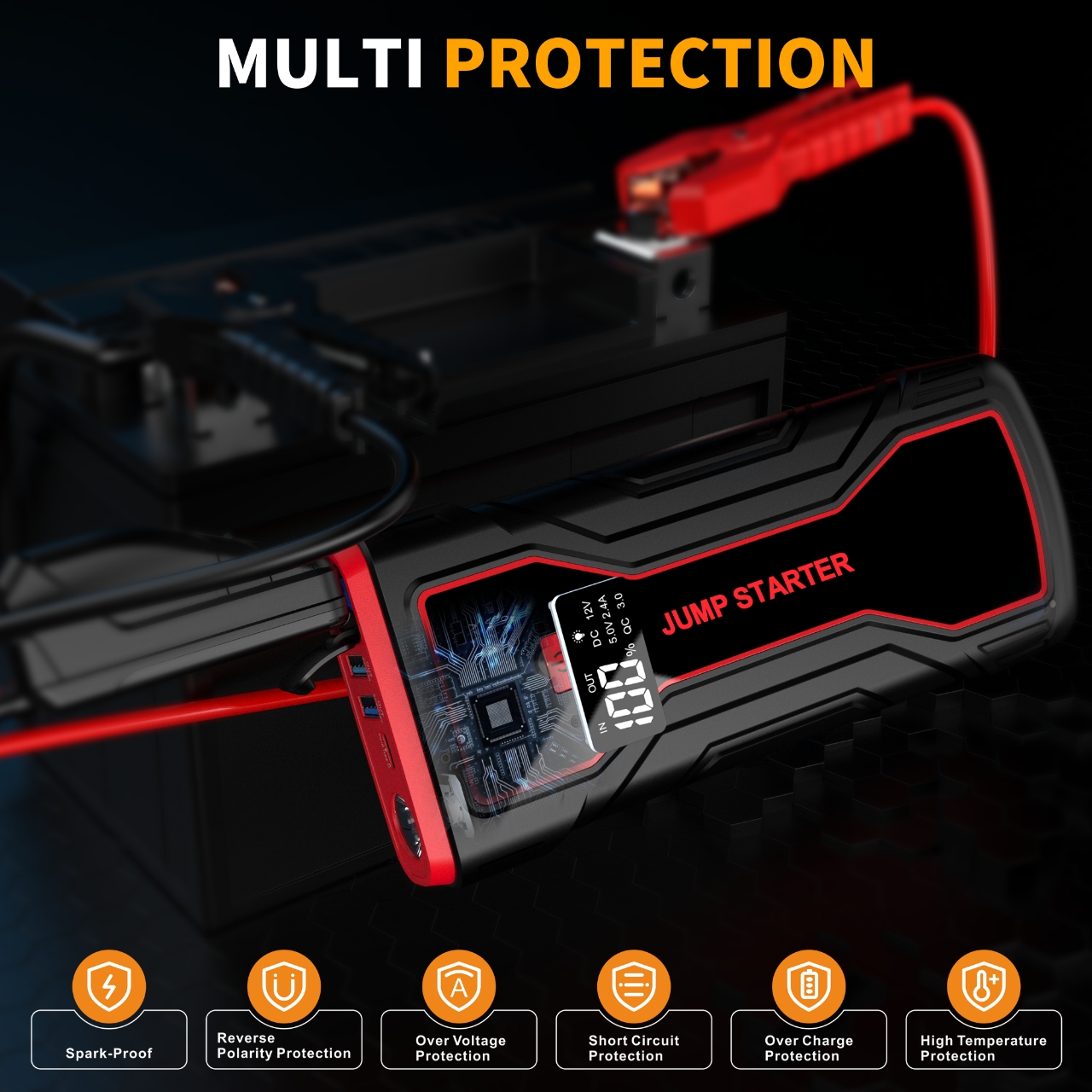 Our jump starter is certified with CE, FCC, KC, IC, CB, RoHS, and UL2743 certifications, with a working temperature range of -20℃ to 60℃ (-4℉ to 140℉). The state-of-the-art safety smart cable and indicator feature an intelligent protection system that includes overcharge, overcurrent, short circuit, reverse polarity, overvoltage, overload, reverse charge, spark proof, low temperature, and high temperature protection, which safeguards the device from damage in case of misoperation.