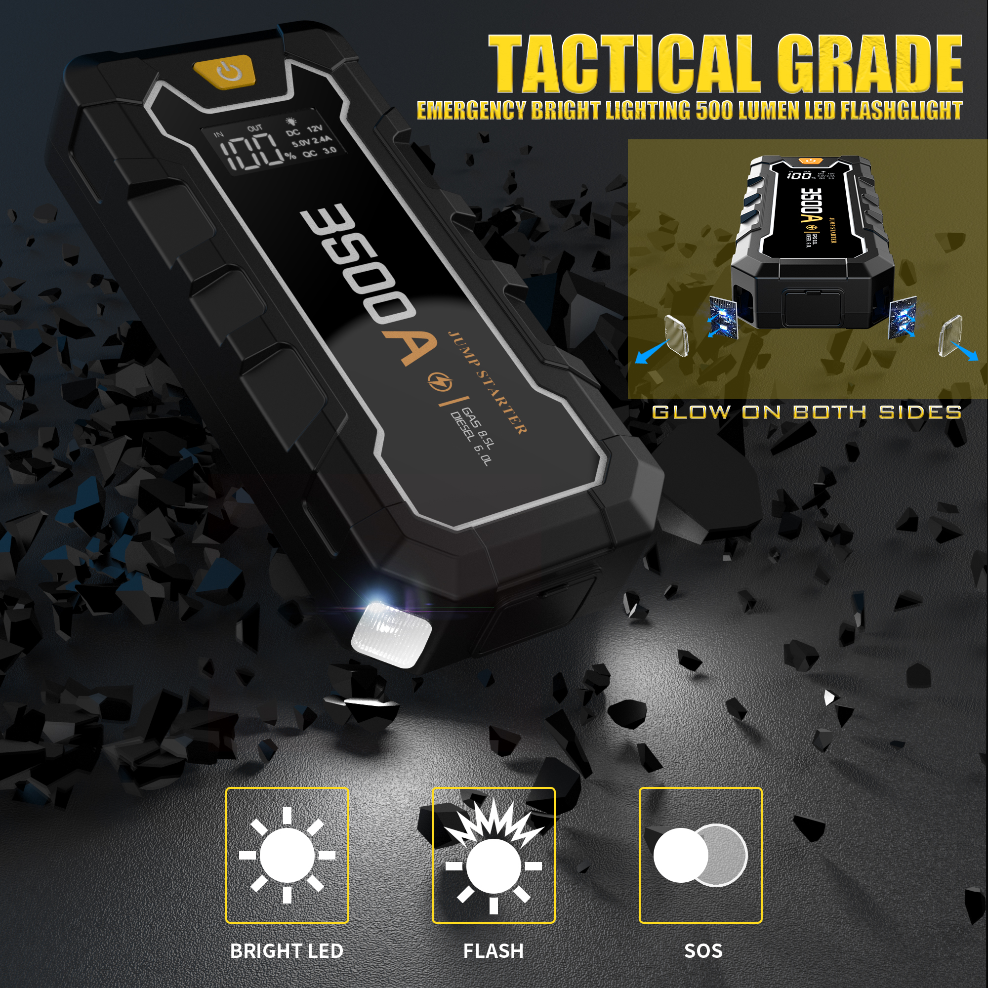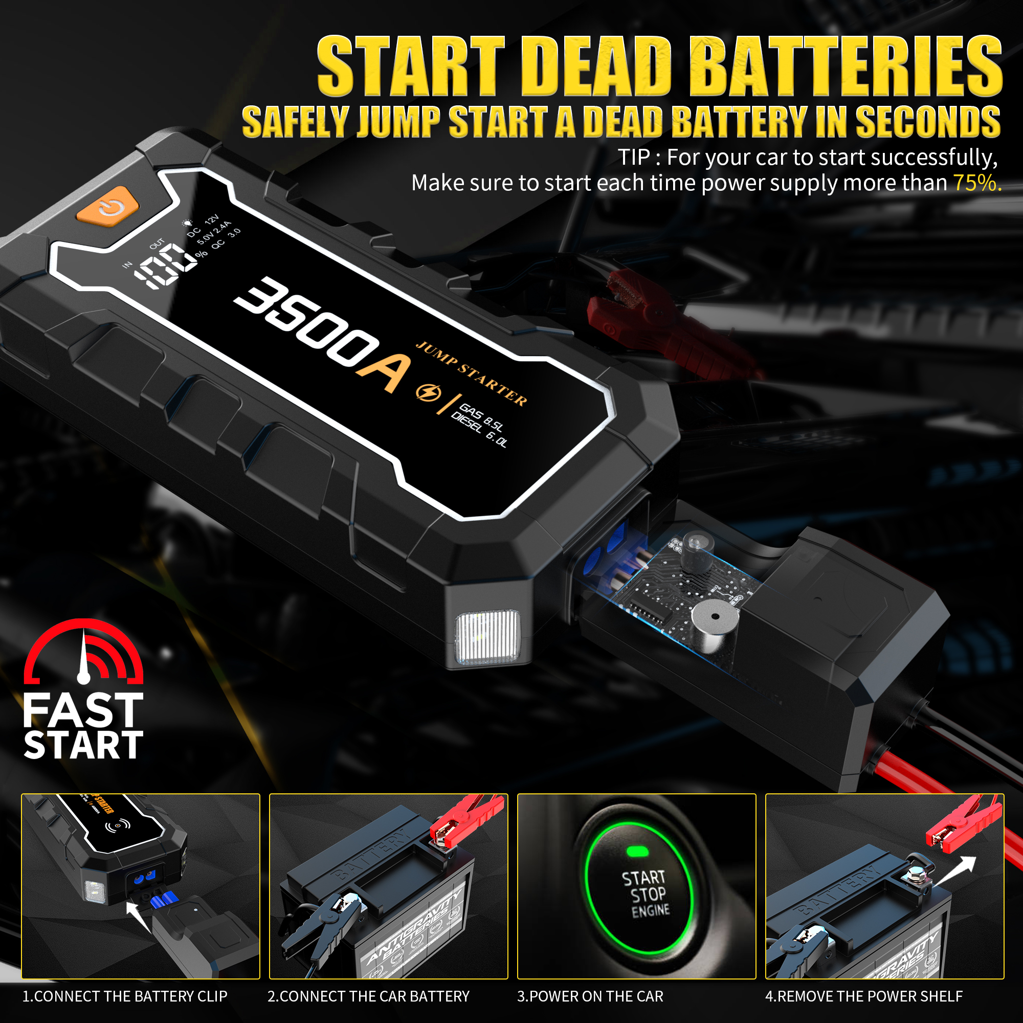 With a 3500A peak current portable jump starter is capable of jump-starting 8.5L gas and 6.0L diesel vehicles, from motorcycles, snowmobiles, cars, SUVs, trucks, lawn mowers, and boats.